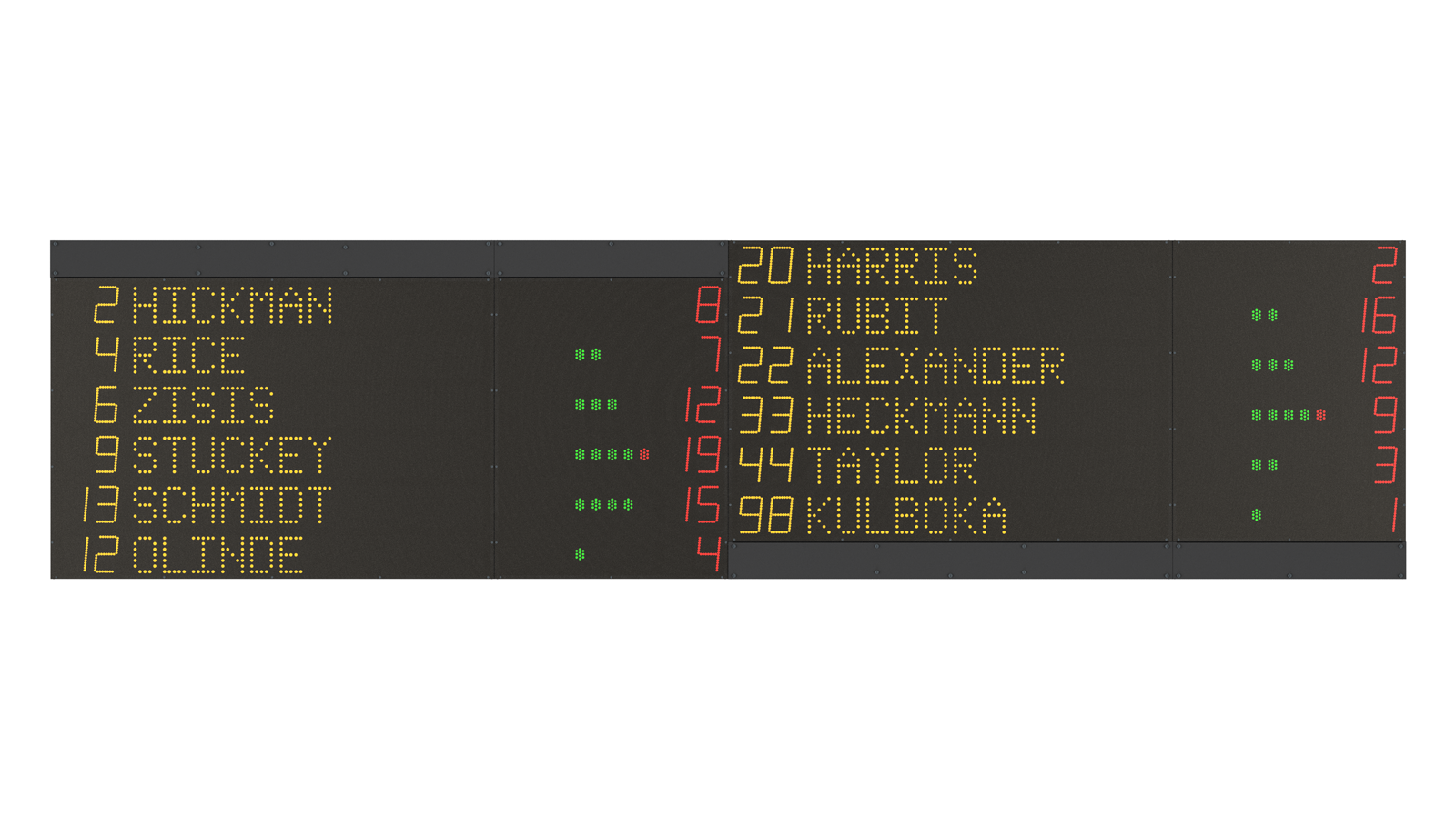 Damit pro Spieler seine jeweiligen Punkte oder Fouls angezeigt werden, kann man ein weiteres Zusatzmodul einsetzen. Entweder das Zusatzmodul „NUMMERN | FOULS“ oder „NUMMERN | FOULS | Punkte“ oder das ganz detaillierte Modul „NUMMERN | Namen | FOULS | Punkte“. Dieses wird neben/unter das Basismodul oder als separate Anzeige montiert. Je Mannschaft können mit diesem Zusatzmodul bis zu zwölf Spielernummern angezeigt werden. Diese Spielstandsanzeigen gibt es in zwei verschiedenen Größen.